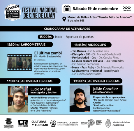 La programación del Festival de Cine de Luján, curada por el Colectivo de Realizadores Audiovisuales fué realizada luego de una gran convocatoria, selección y visualización que incluyó largometrajes, cortometrajes y videoclips proyectados a lo largo de 4 días en el Museo de Bellas Artes de Luján y en el cine Cinema Rosso.